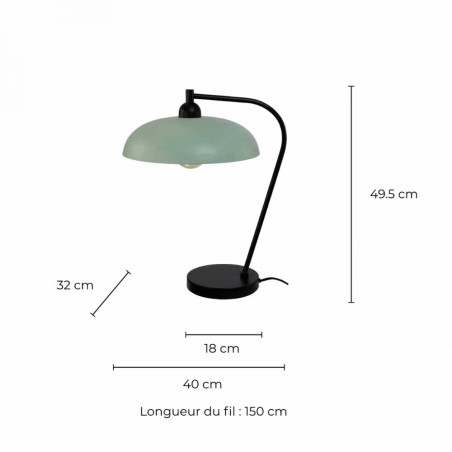 Fabriquée en métal, elle mesure 49,5 cm de hauteur. L’abat‑jour fait 32 cm de diamètre, le socle 18 cm, et son câble de 150 cm permet de la placer facilement sur une table de chevet, un bureau, une console d’entrée ou même un meuble de salon.