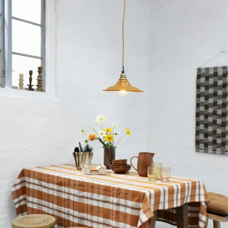 Les finitions dorées de la douille et le câble textile ocre apportent une touche raffinée et élégante. Cette suspension orange émaillée s’intègre parfaitement dans une décoration scandinave ou industrielle.