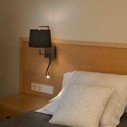 Notre gamme de produit offre un large choix d’appliques murales tout à fait adaptées aux hôtels. Les luminaires privilégiés dans ces établissements sont les appliques avec 2 sources lumineuses composées d’un éclairage général et d’une liseuse orientable. Elles apportent un vrai confort aux clients avec une lumière adaptée à chacun et des interrupteurs à portée de main. Sur l’aspect esthétique, cette solution permet de ne pas encombrer la table de nuit et aucun fil électrique ne vient “polluer” l’espace. De plus, très apprécié par les hôtels, ces appliques de chevet équipées d’abat-jour pourront être changés en cas de salissures ou de casse sans avoir besoin de changer la totalité du luminaire.