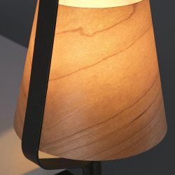 La lumière diffusée à travers la feuille de placage du bois de cerisier laisse apparaitre les veines de ce matériau naturel magnifique pour une ambiance chaleureuse. Le contraste du bois et du noir en font un luminaire design qui convient parfaitement dans une décoration contemporaine.